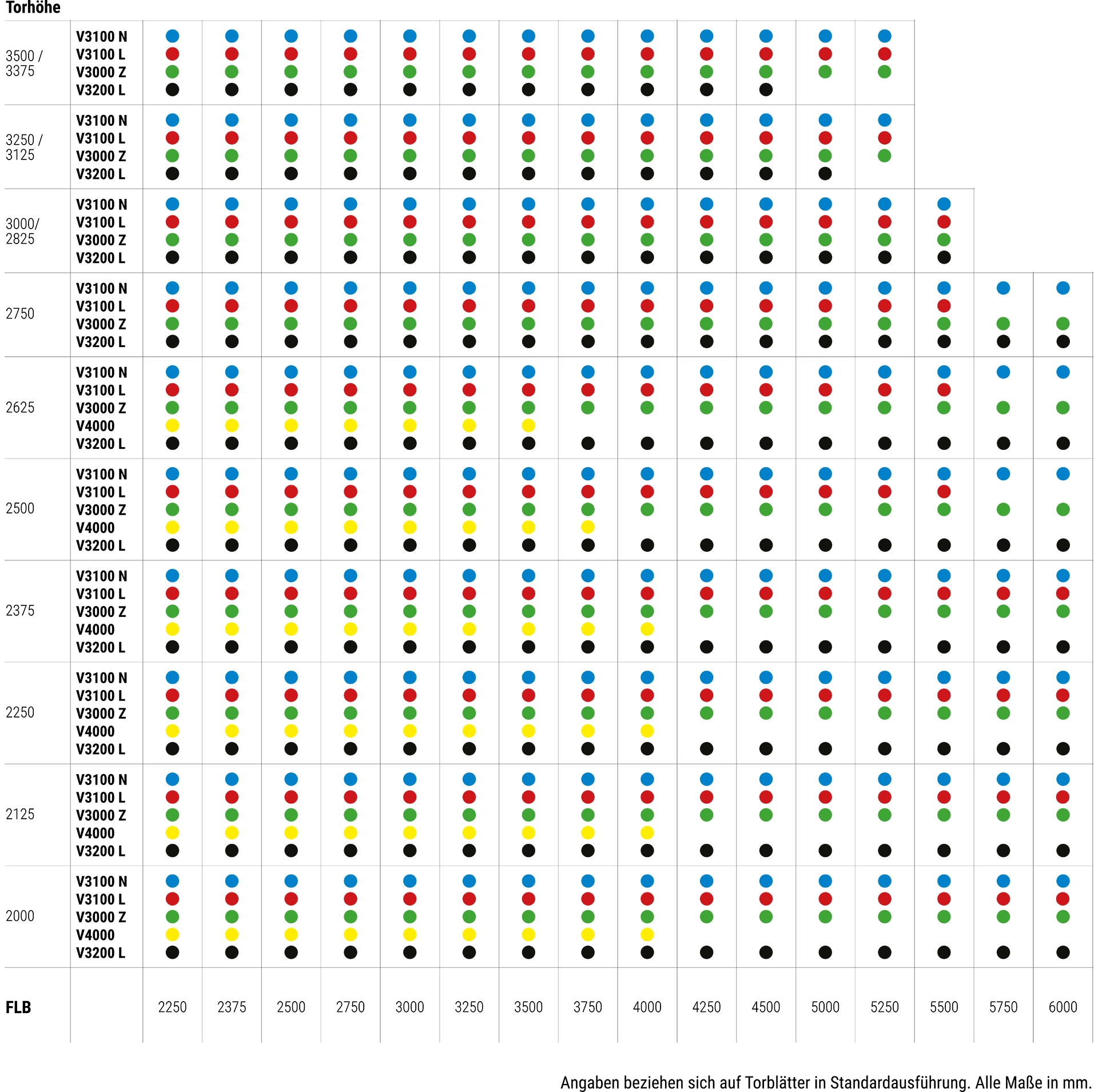 Folgende Tabelle zeigt Ihnen, bei welchen Torgrößen Sie die jeweiligen Beschläge einsetzen können: